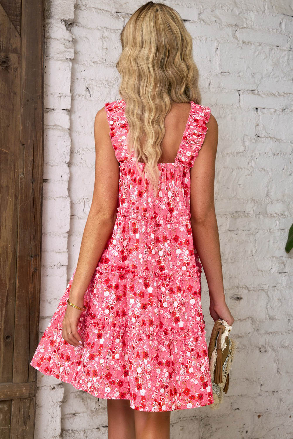 Rose Tiered Ruffled Square Neck Sleeveless Floral Mini Dress
