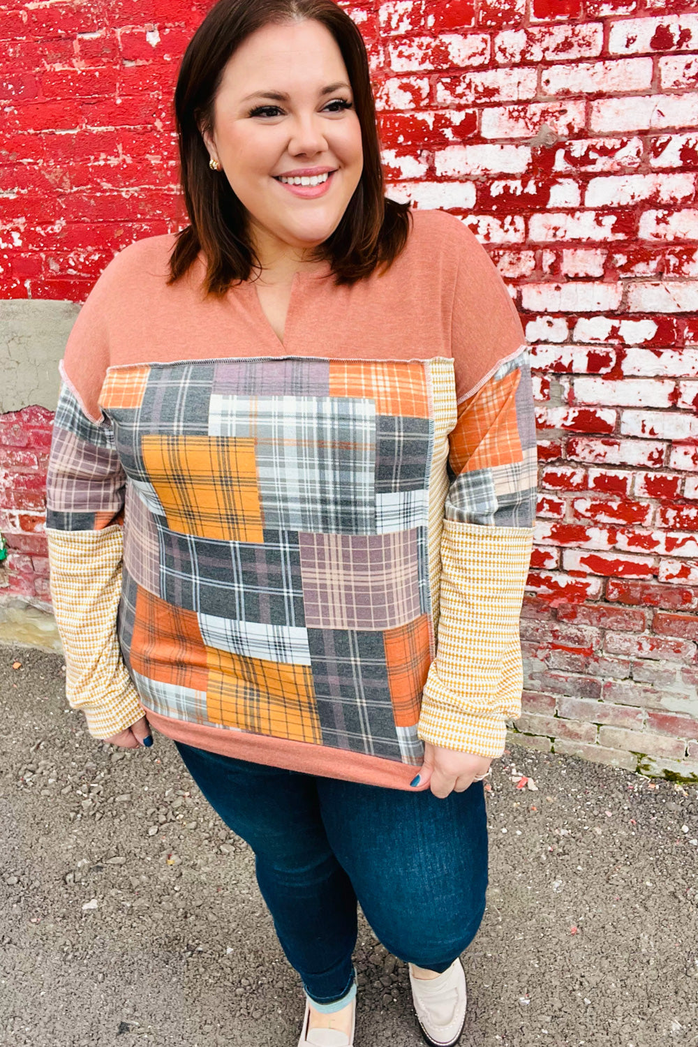 What I Like Rust/Charcoal Two Tone Knit Plaid V Neck Top
