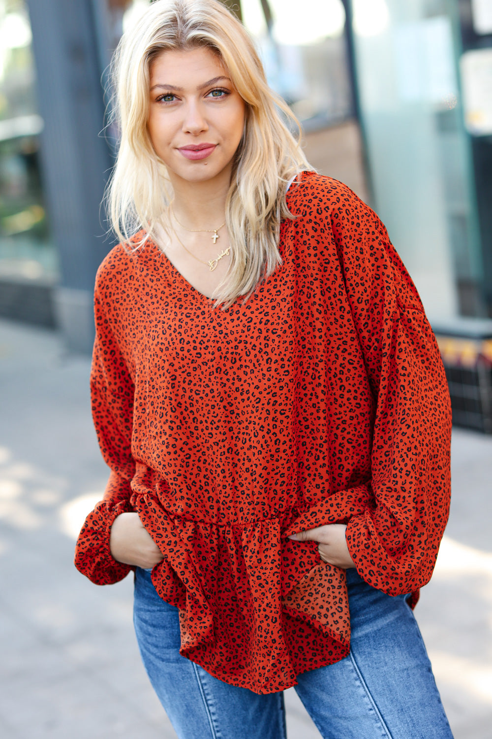 Light weight and perfect for layering under cardigans or jackets. this rust babydoll peplum top with leopard print has a V neck to showcase your fav accessories and features long elegant bubble sleeves. Perfect for the office or a fall date!