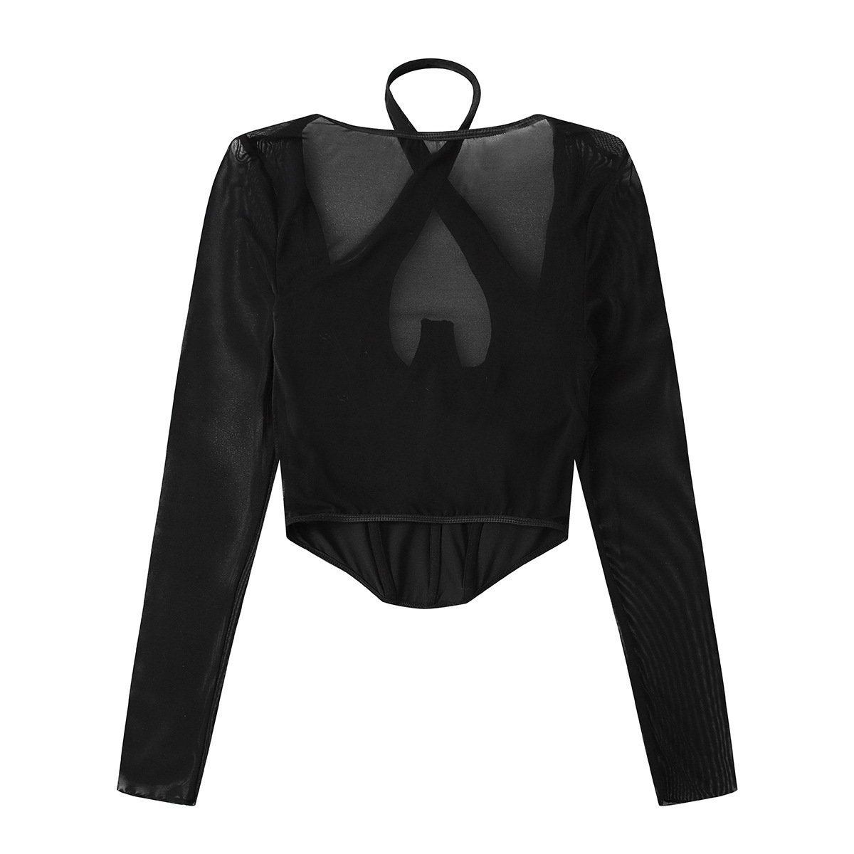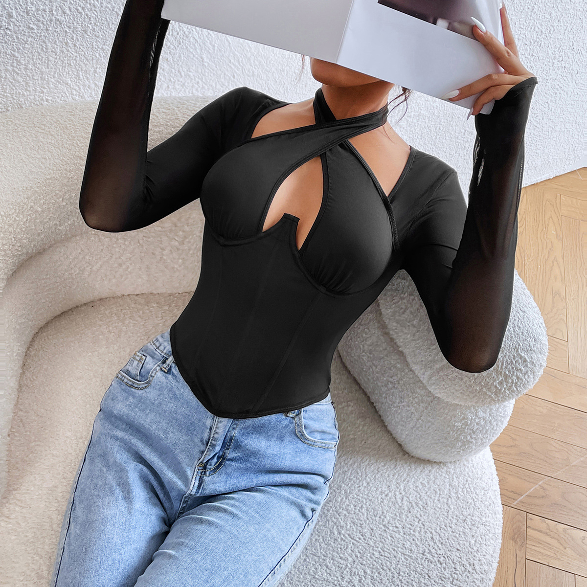 Sexy Cross Halterneck Low Cut See through Long Sleeved T shirt Steel Ring Boning Corset Waist Top
