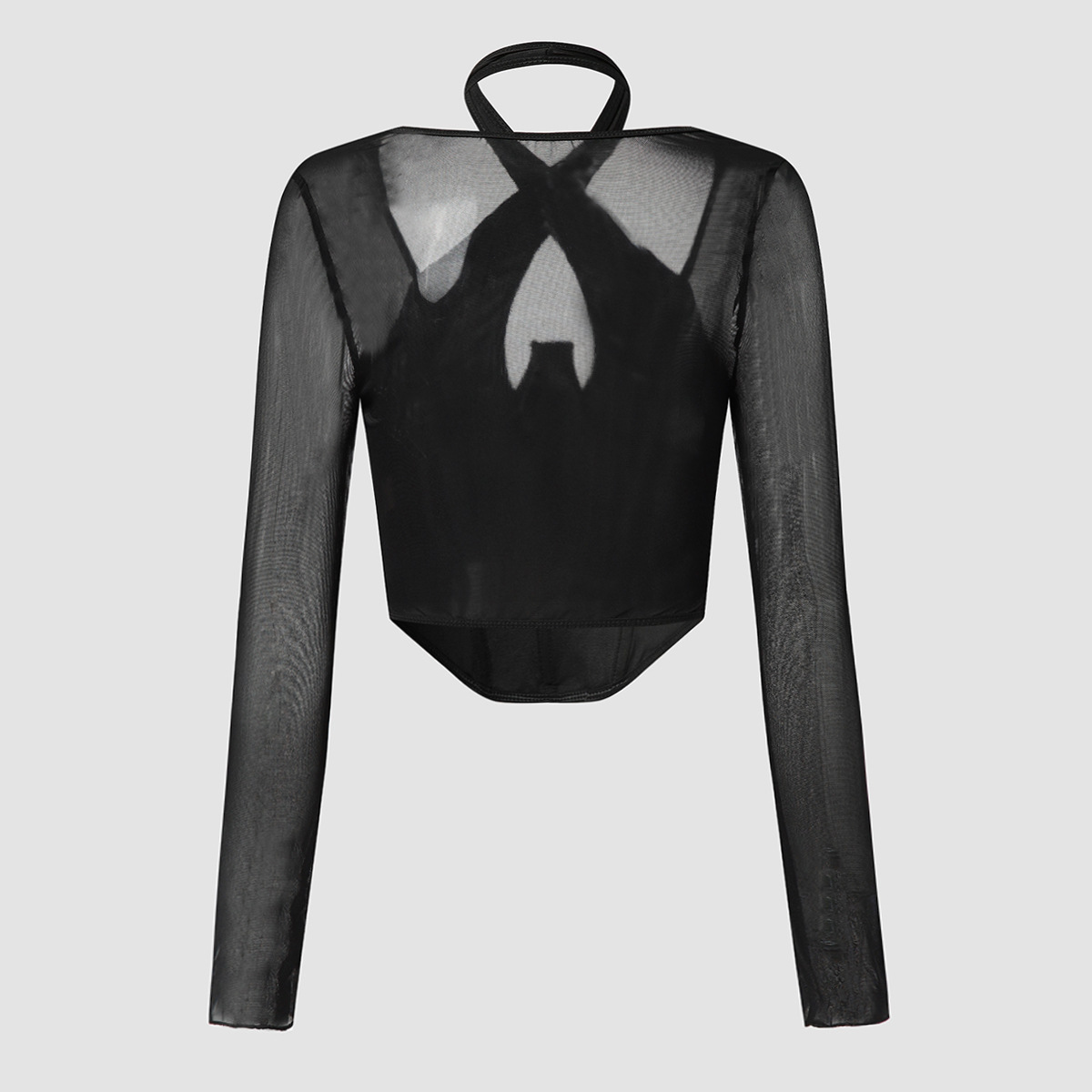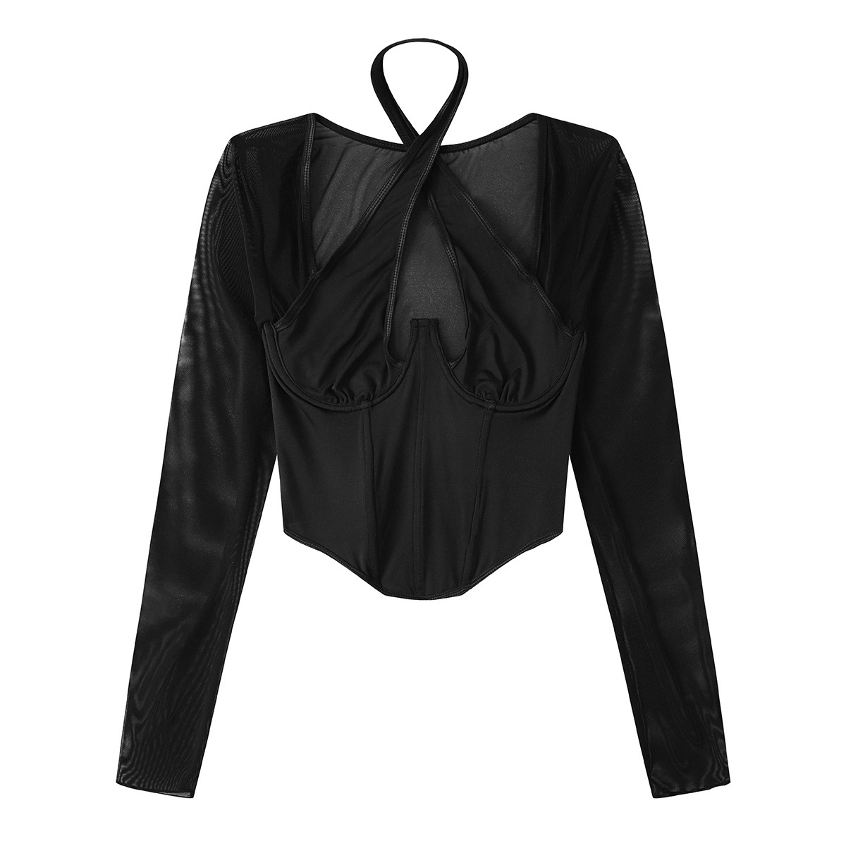 Decrease quantity for Sexy Cross Halterneck Low Cut See through Long Sleeved T shirt Steel Ring Boning Corset Waist Top