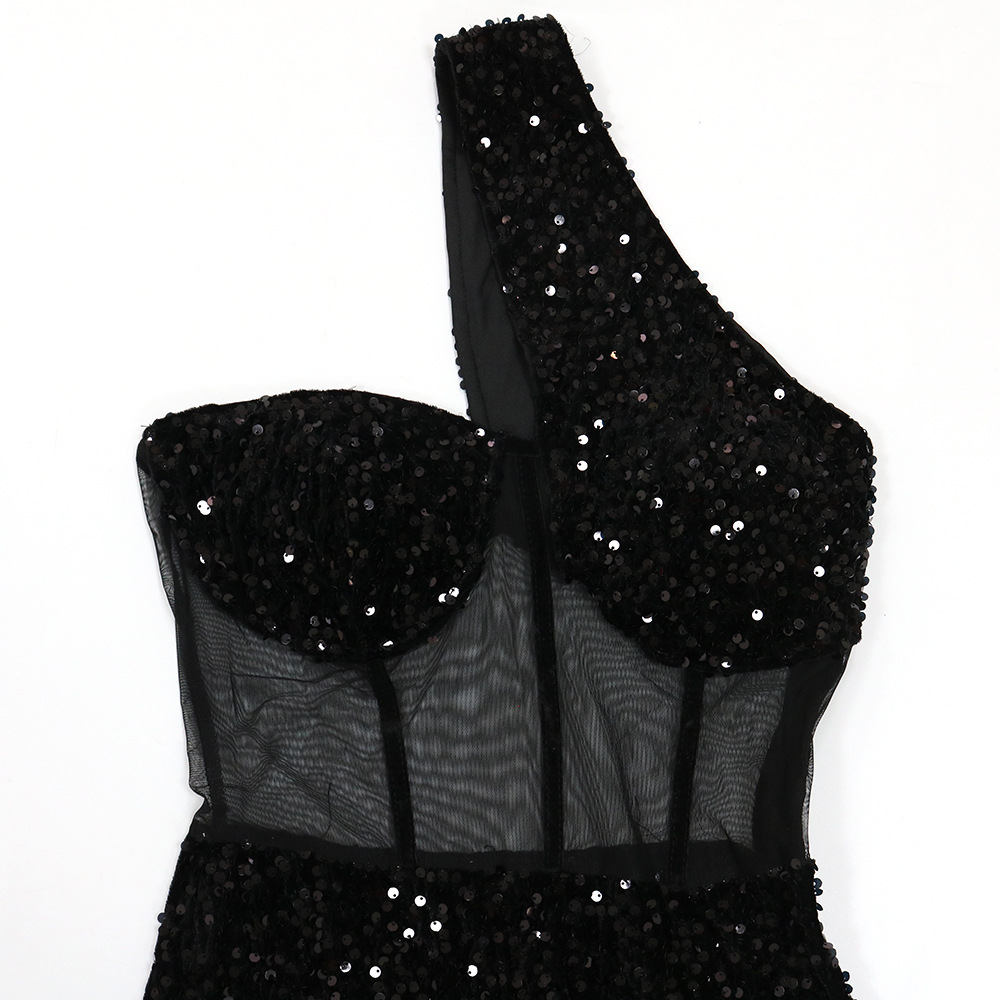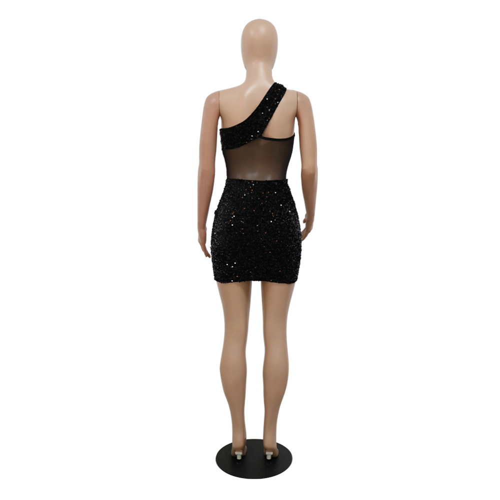 Sexy Diagonal Collar Sequin Stitching Polyester Net Nightclub Party Sheath Dress Women