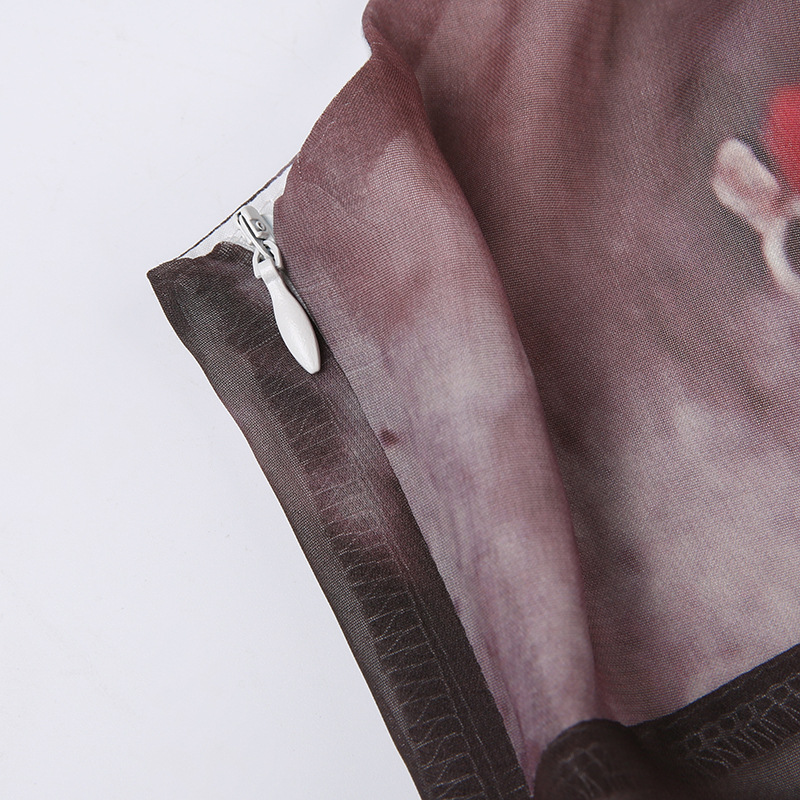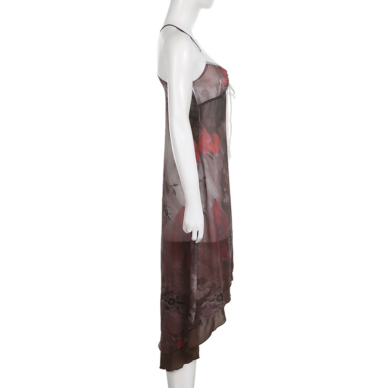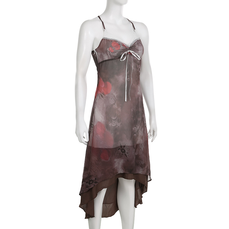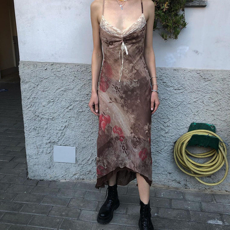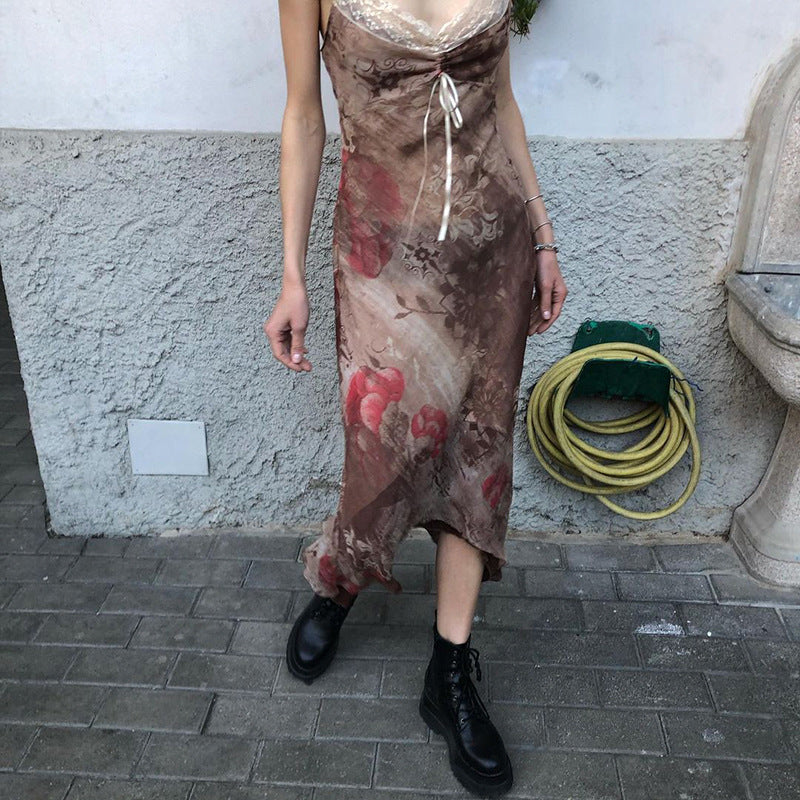 Sexy Lace Stitching Retro Printed Design Back Cross Strap Cami Dress