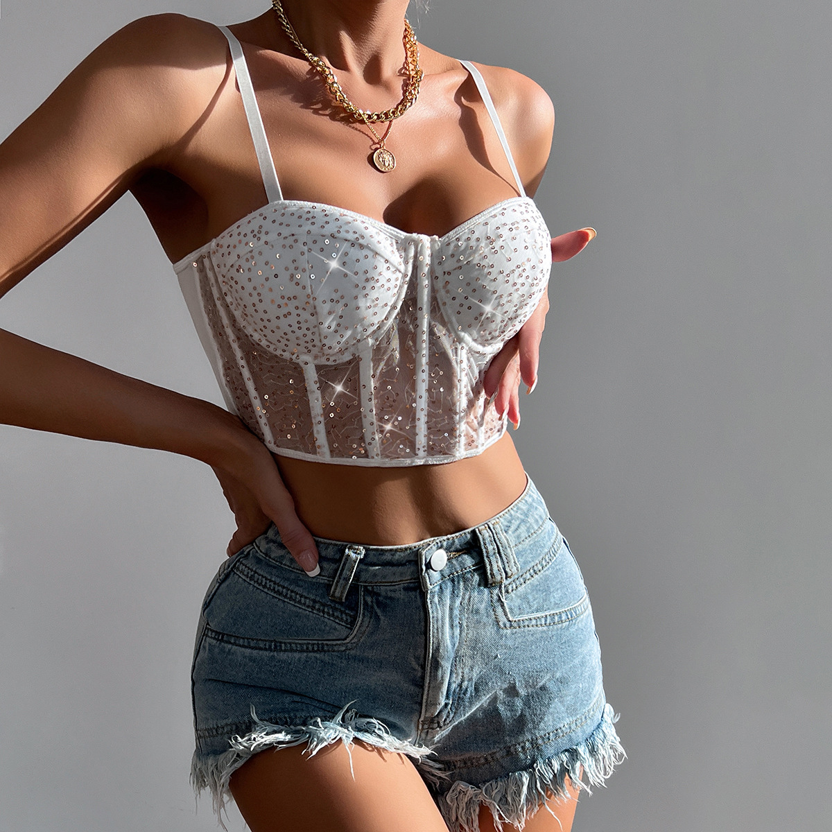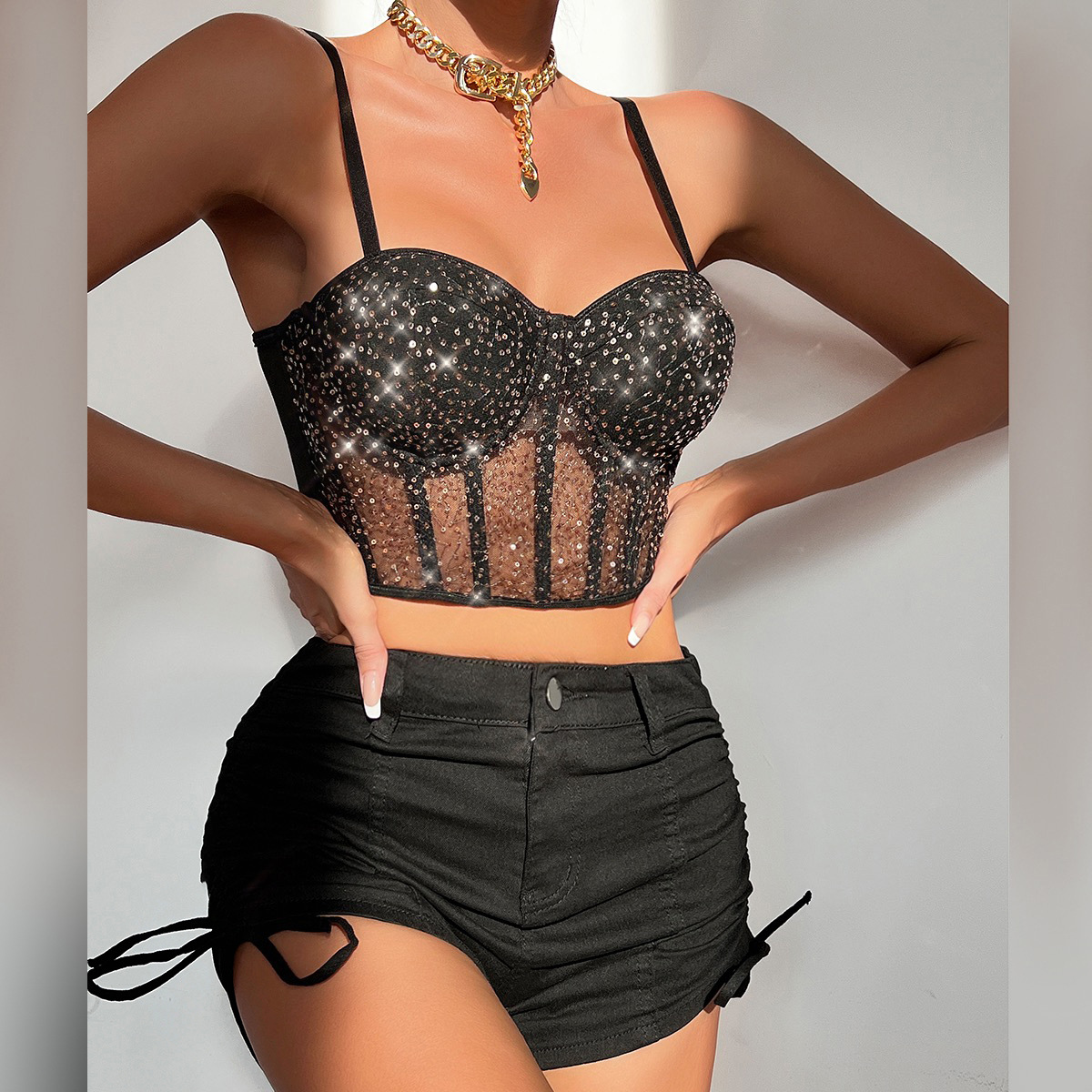 Decrease quantity for Sexy Low Cut Sexy See through Mesh Patchwork Sequin Short Bone Clothing Women