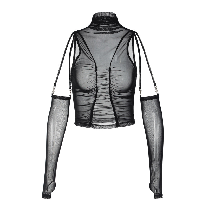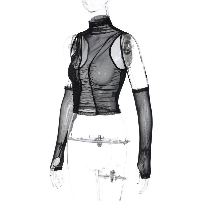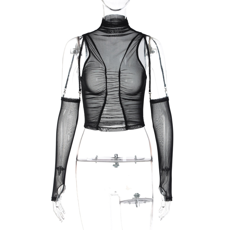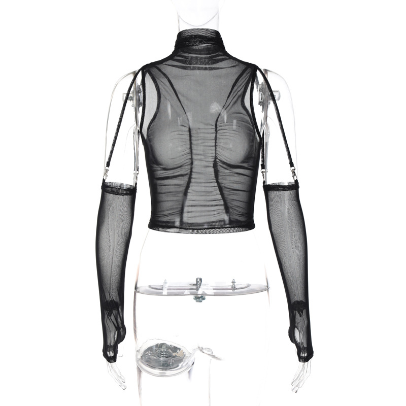 Sexy Women Clothing Sexy See through Turtleneck Slim Mesh Oversleeve Short Top One