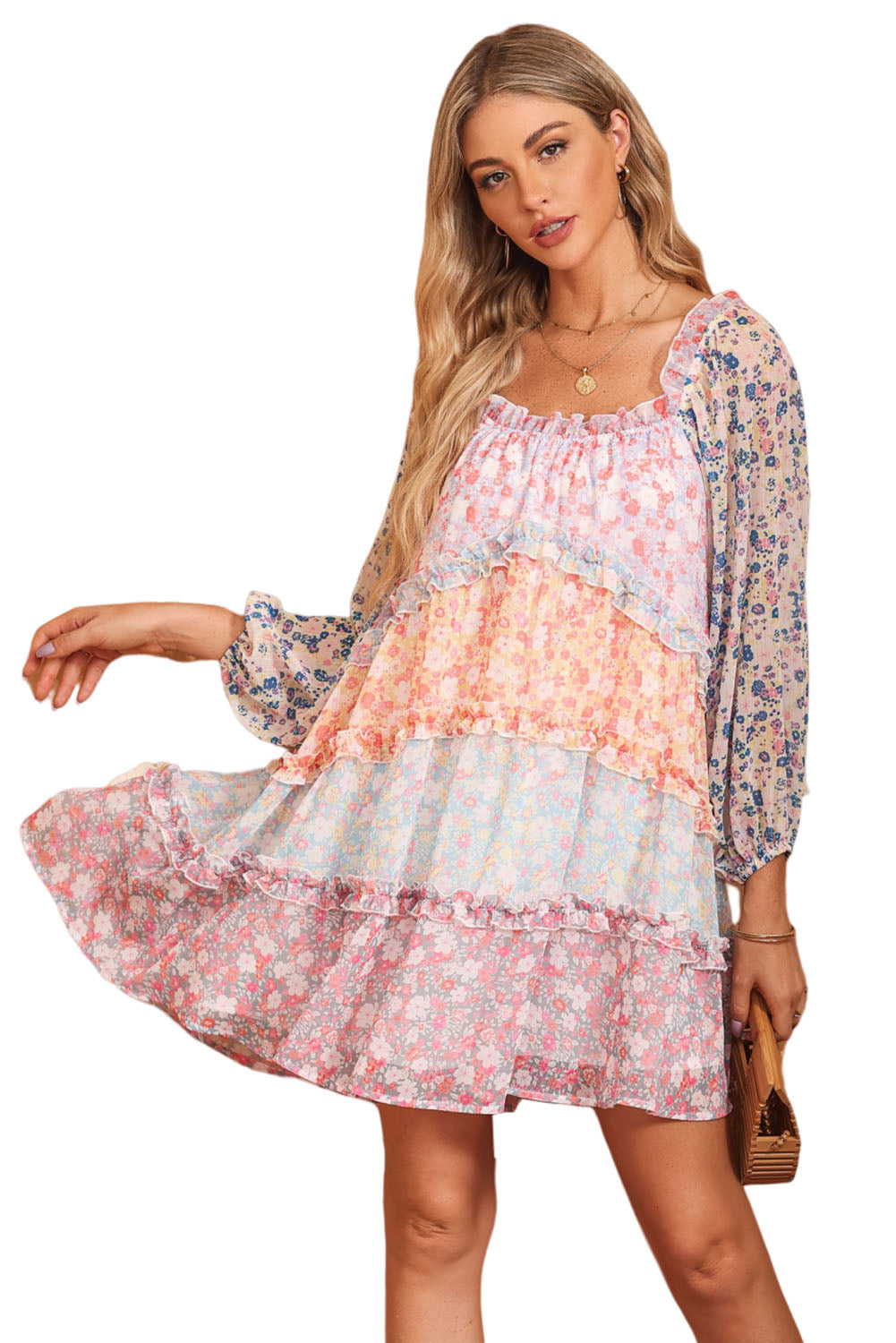 Sky Blue Floral Colorblock Tiered Puff Sleeve Dress