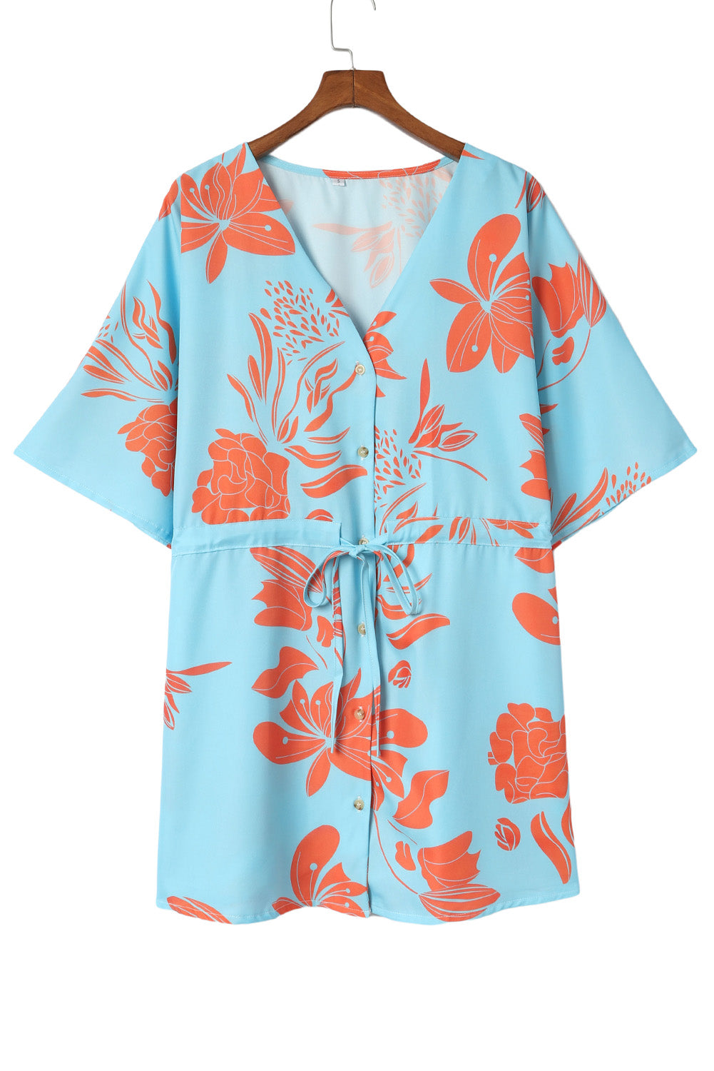 Sky Blue Geometric Print Button Drawstring Batwing Sleeve Dress