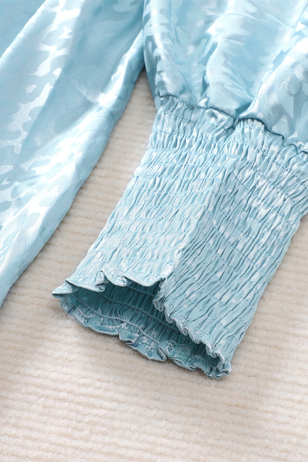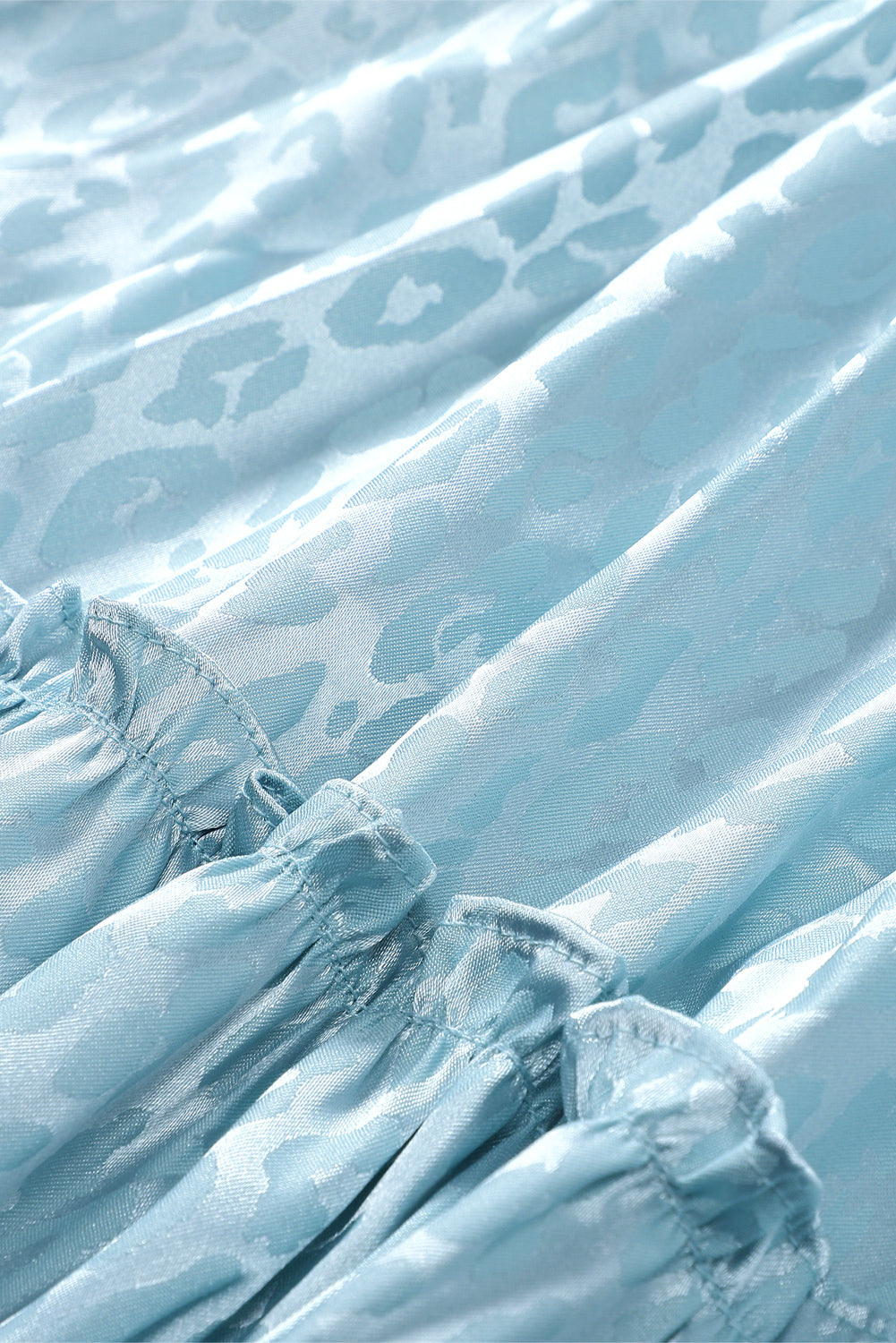 Sky Blue Split Sleeves Smocked Waist Leopard Satin Dress