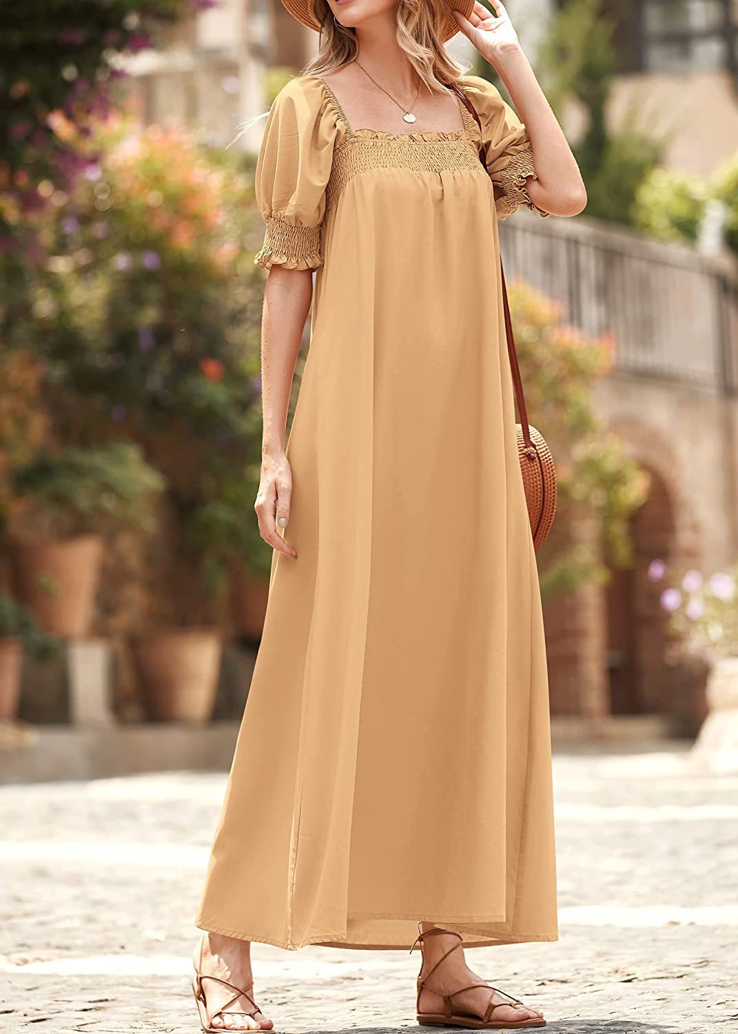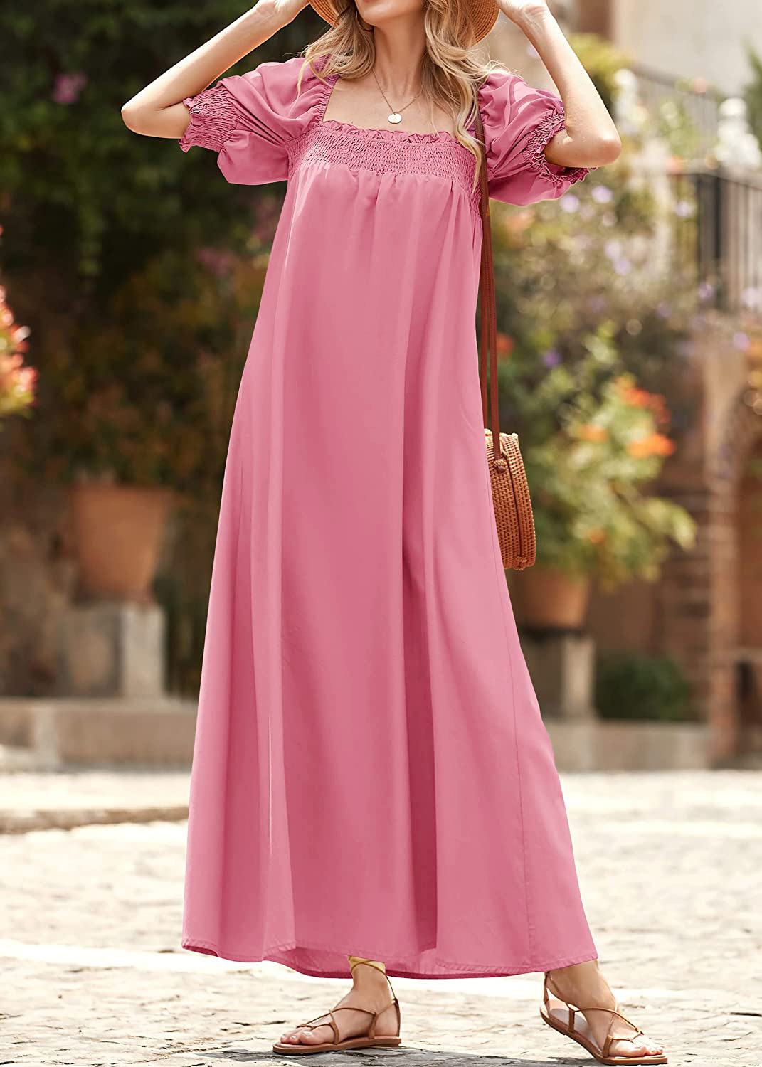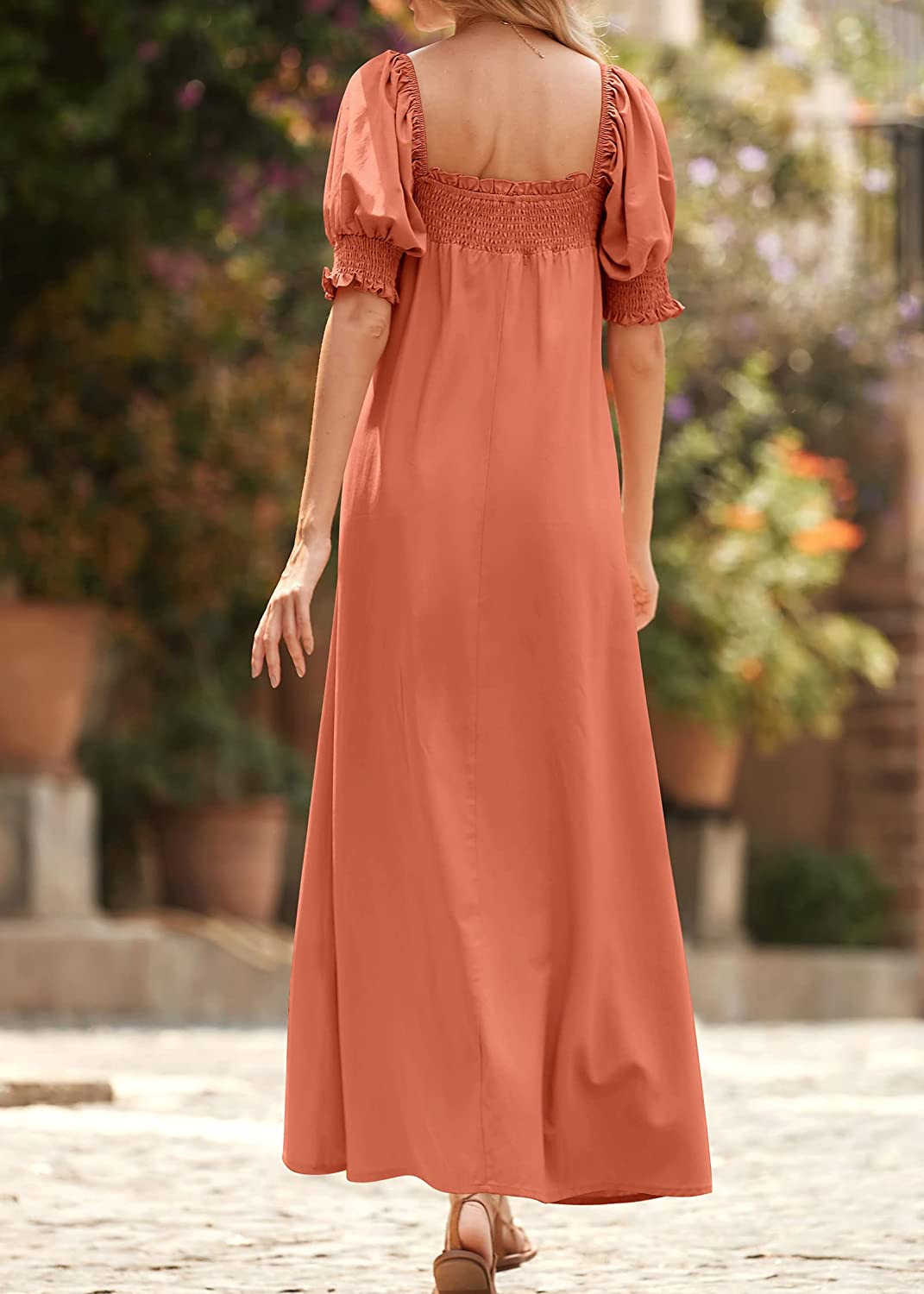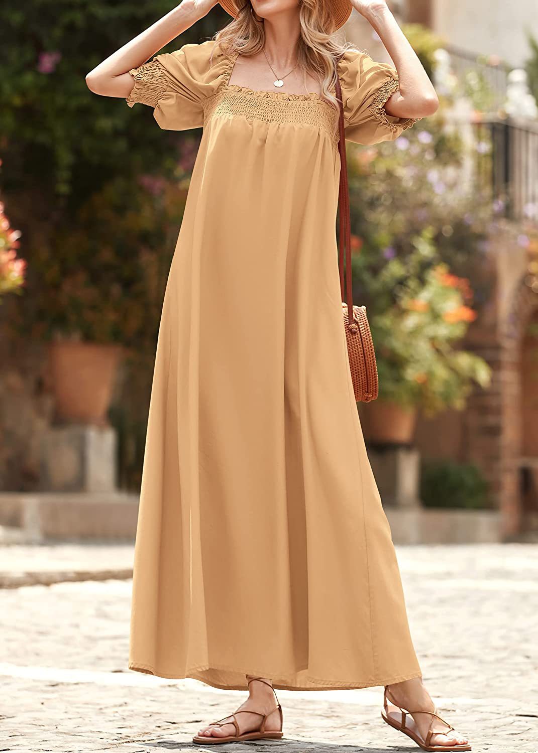 Spring Summer Puff Sleeve Square Collar Dress Solid Color Loose Casual Pocket Maxi Dress