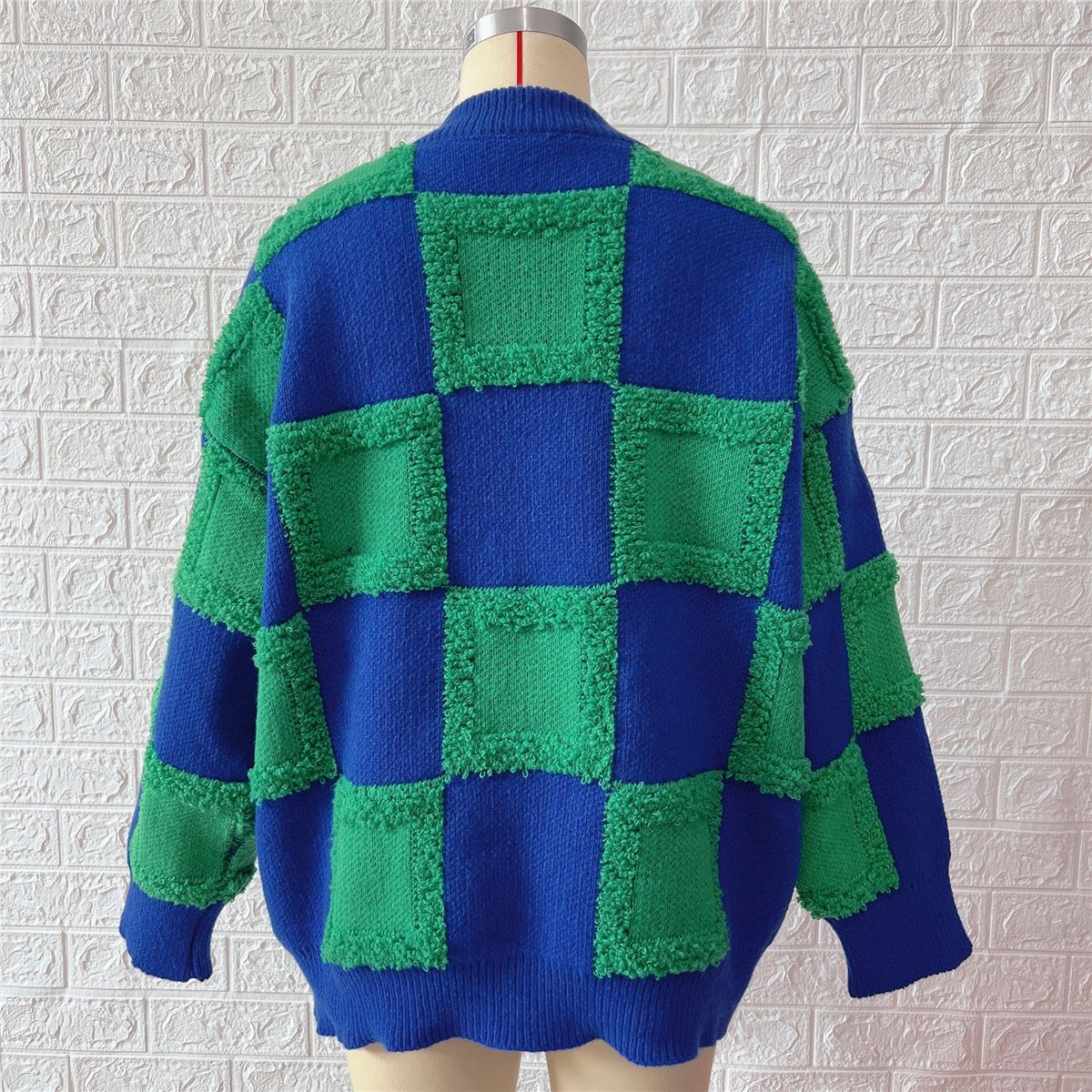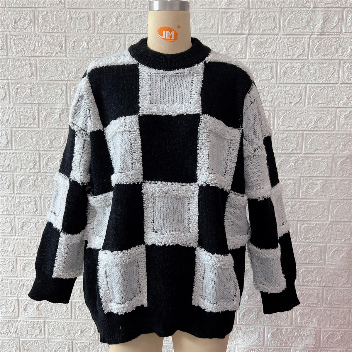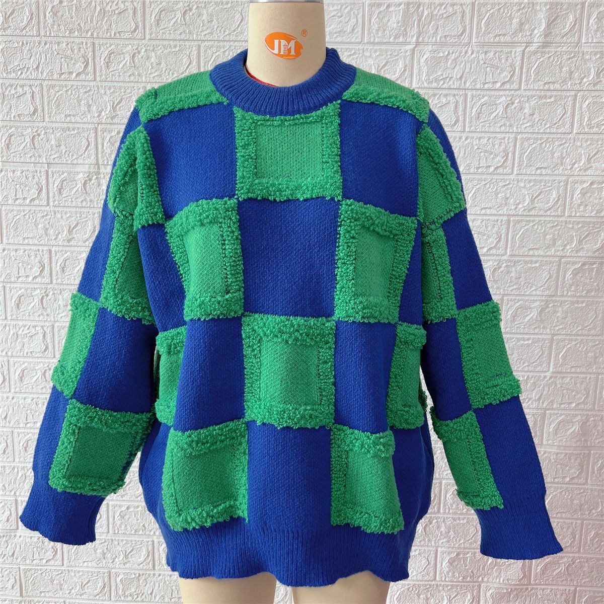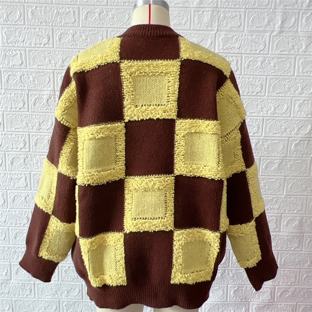 Street Cool Loose Checkered Thick round Neck Long Sleeved Knitted Pullover Sweater Women