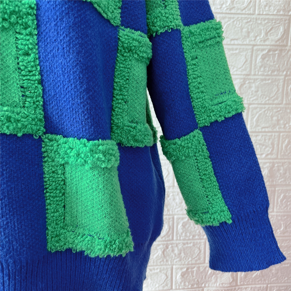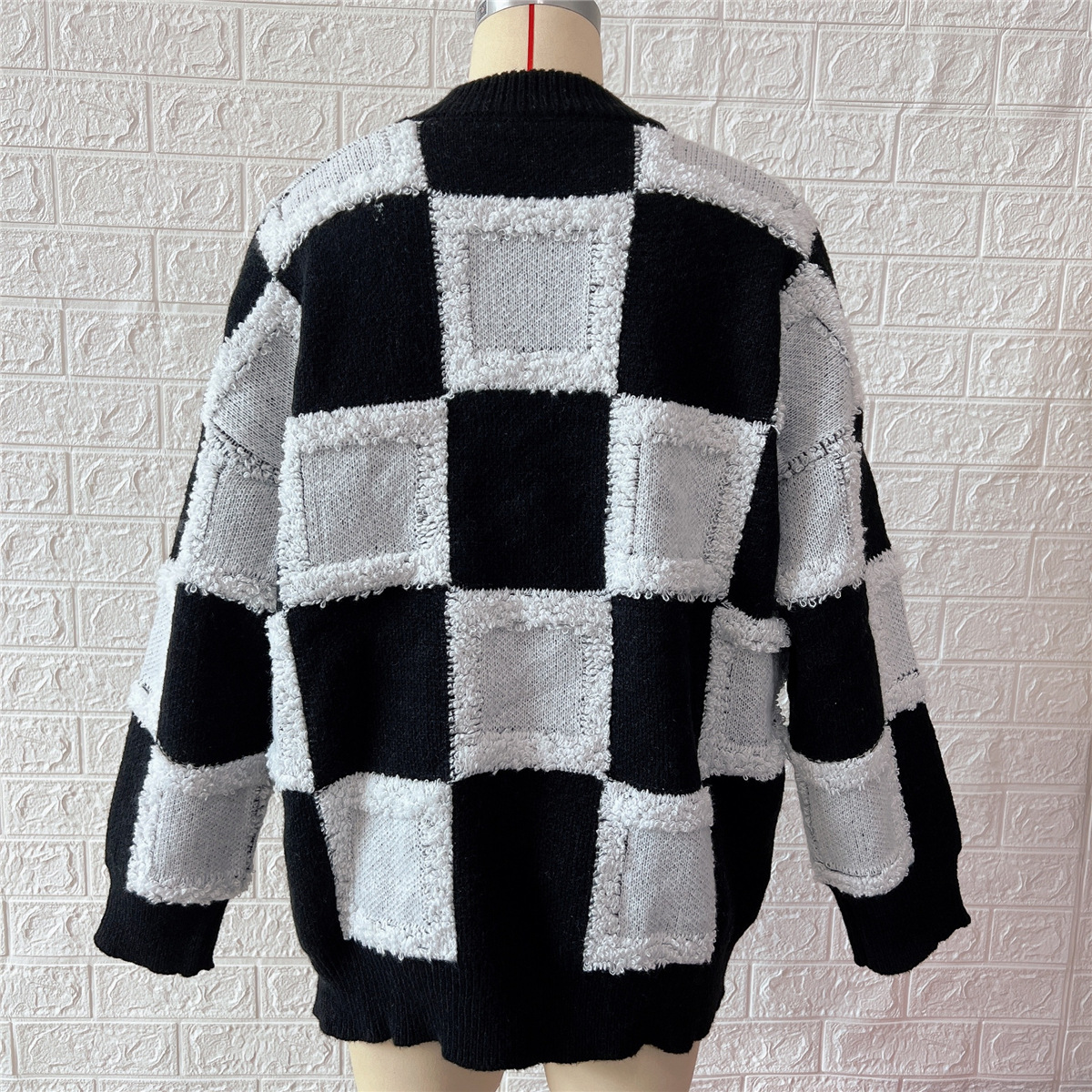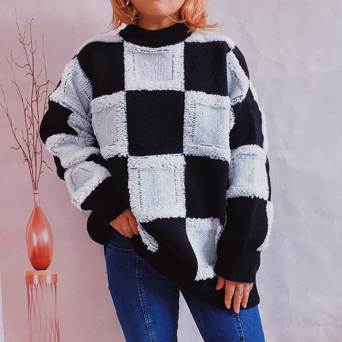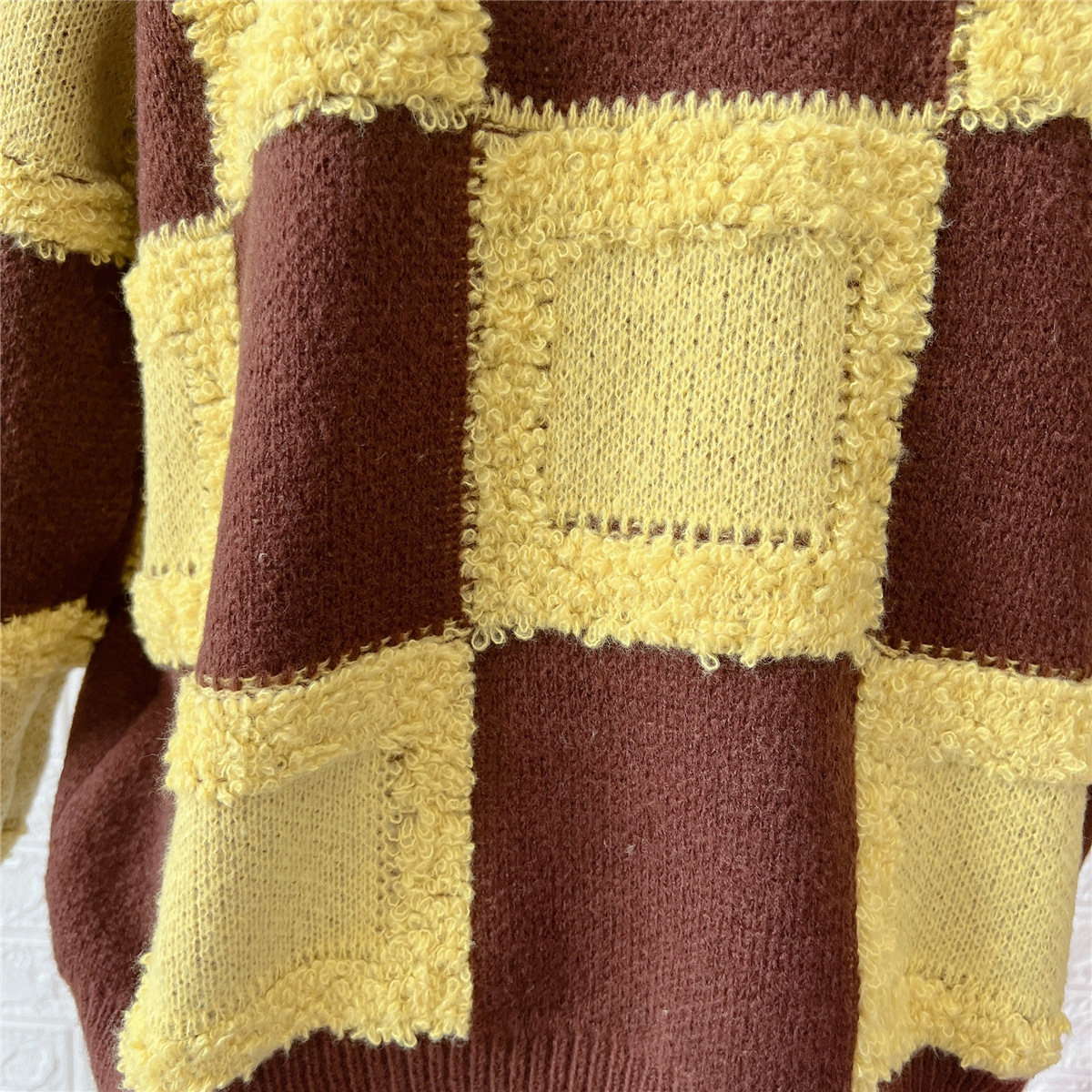 Street Cool Loose Checkered Thick round Neck Long Sleeved Knitted Pullover Sweater Women
