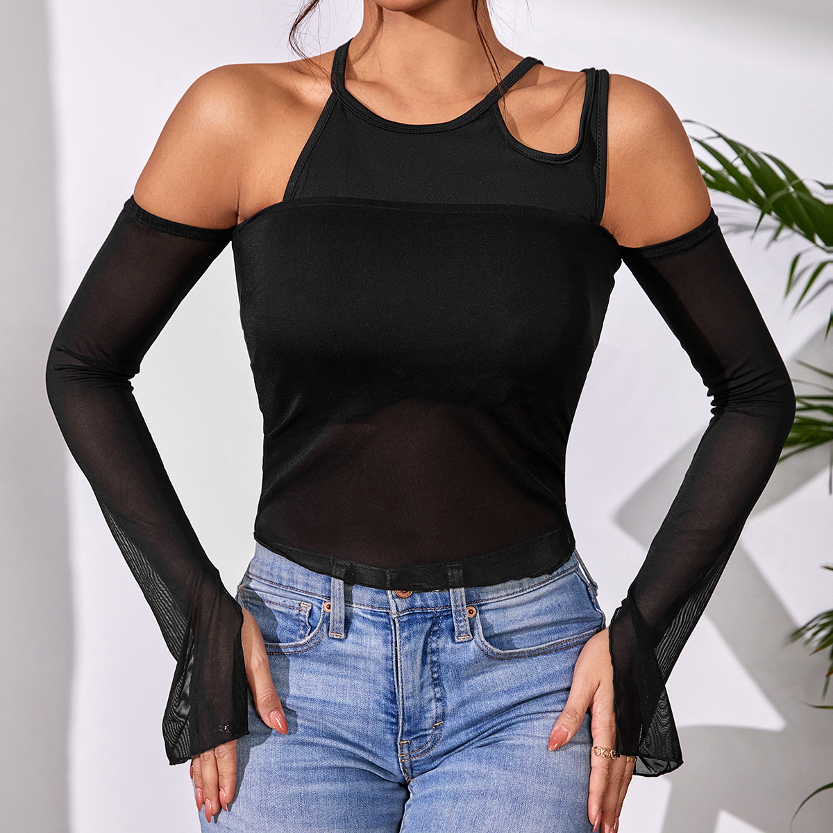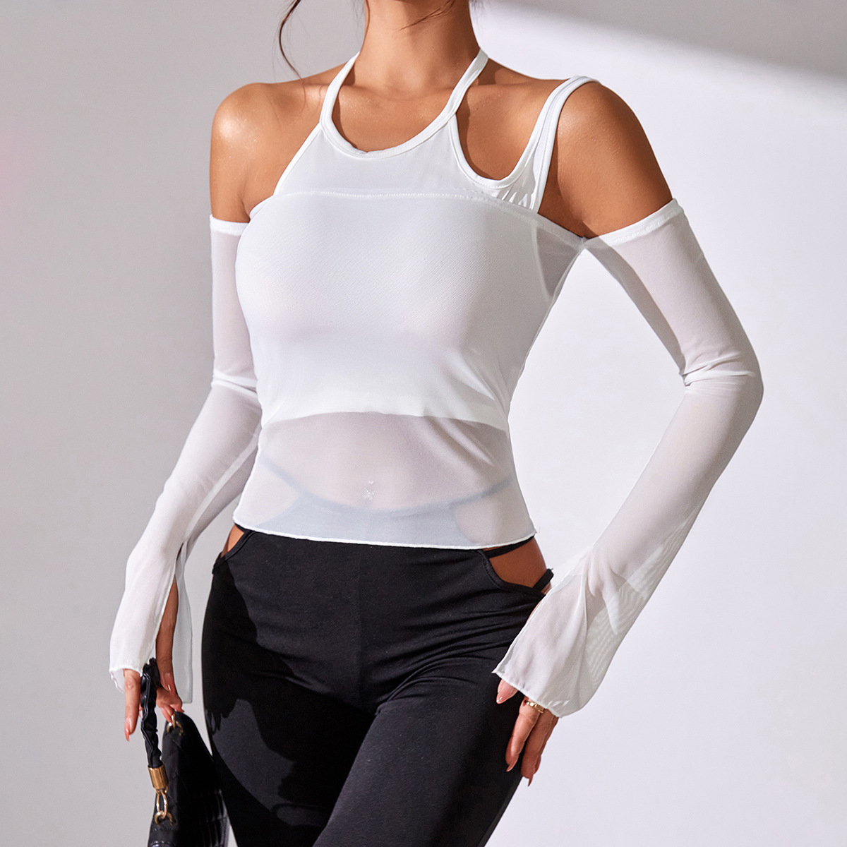 Street Sexy Backless Vest Solid Color Mesh Long Sleeved Top Two Piece Set