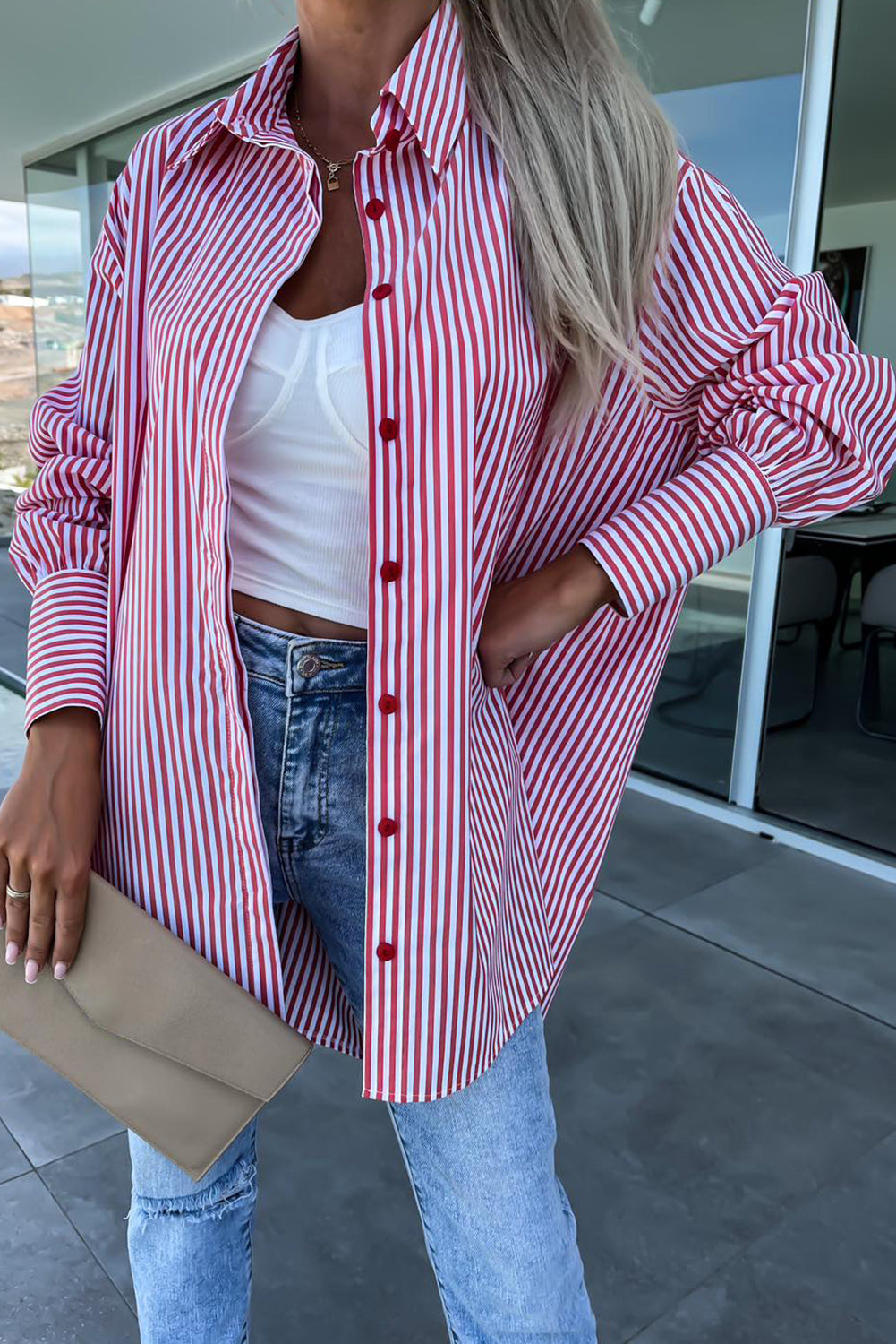 • It features classic striped prints. bishop sleeves. and a button-up front