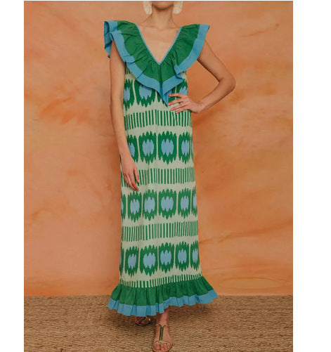 Crafted with exquisite craftsmanship. this dress features a waistband and side slits that elegantly accentuate the silhouette. while the flared sleeves and V-neckline are highlighted by contrasting silhouettes. symbolizing elegance rooted in meticulous details.