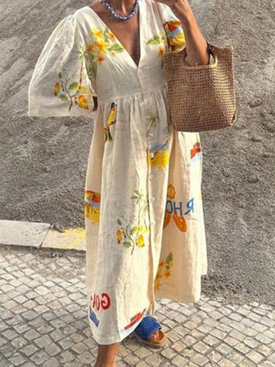 A casual printed loose dress with buttons that can be opened at will. It can be paired with flat shoes and a tote bag. suitable for any occasion.