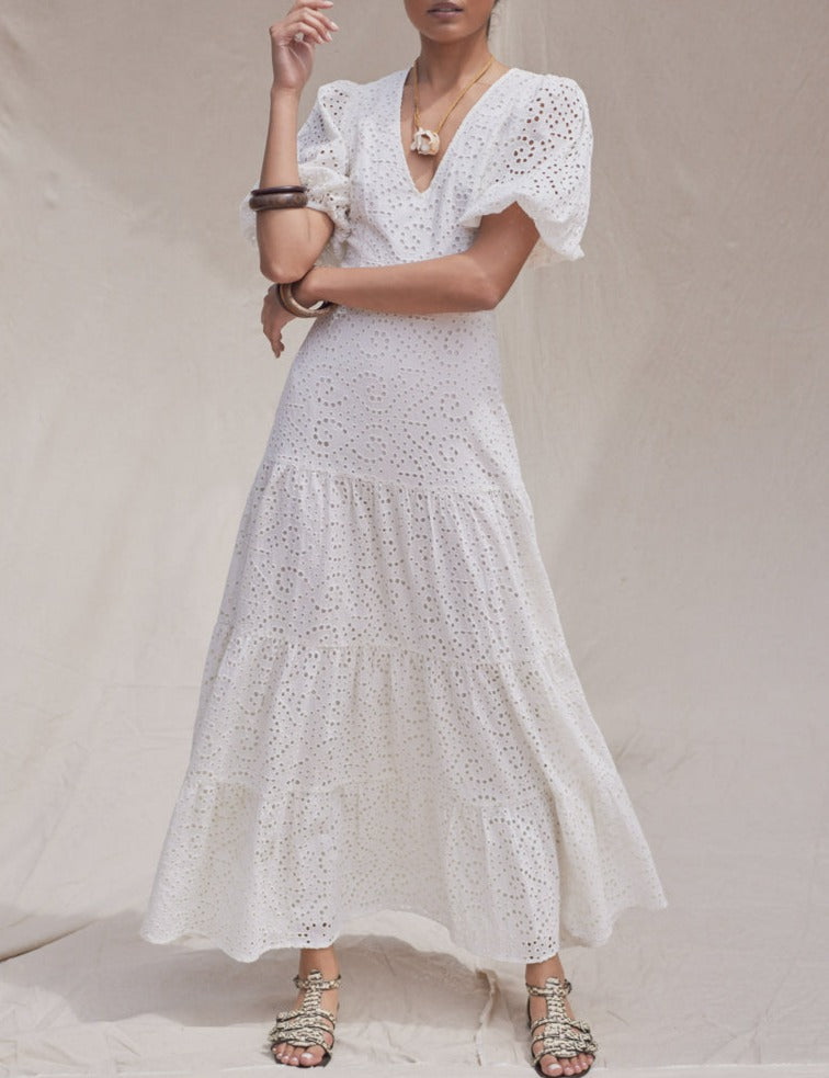 White Cotton Eyelet Puff Sleeve Midi Dress