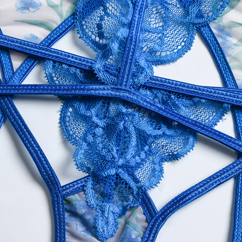 Women Clothing Mesh Floral Print Lace Stitching Sexy Underwear Three-Piece Set